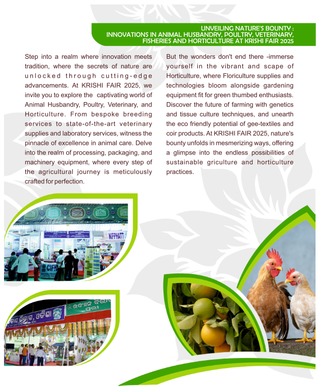 This Exhibition covers the entire spectrum of Agriculture i.e Aquaculture, Floriculture , Pisciculture , Animal Husbandry etc.